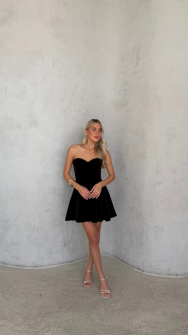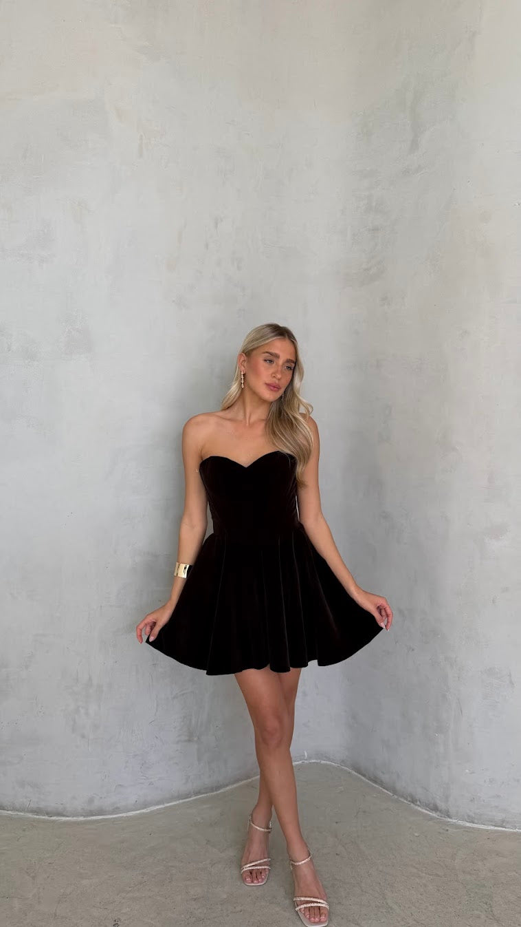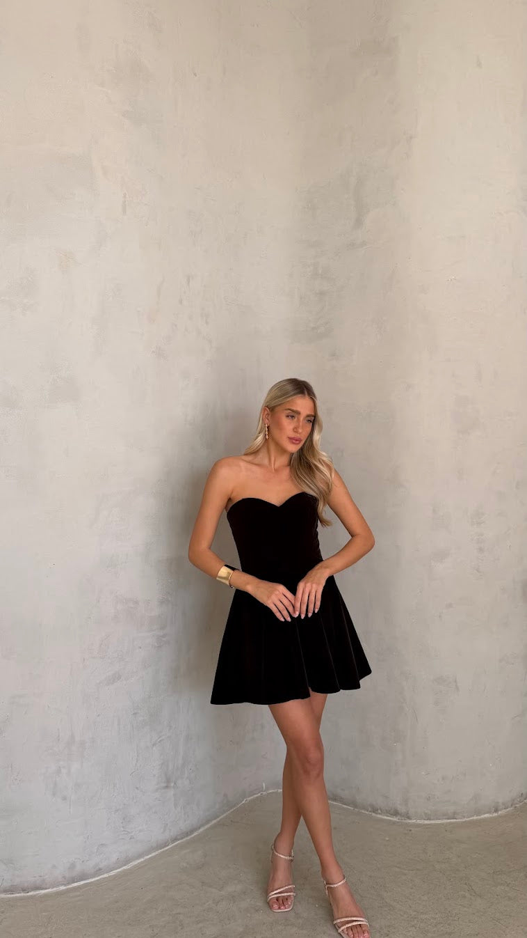 שמלת סטרפלס בעיצוב נקי ואלגנטי, עם גזרה מחמיאה המדגישה את קווי הגוף בצורה טבעית. השמלה עשויה בד רך ונשפך, בעל מגע נעים וגמישות קלה, היושב בצורה חלקה על הגוף ומאפשר נוחות לאורך כל הערב. החצאית באורך מיני עם נפילה רכה היוצרת תנועה עדינה ומראה נשי וקליל.