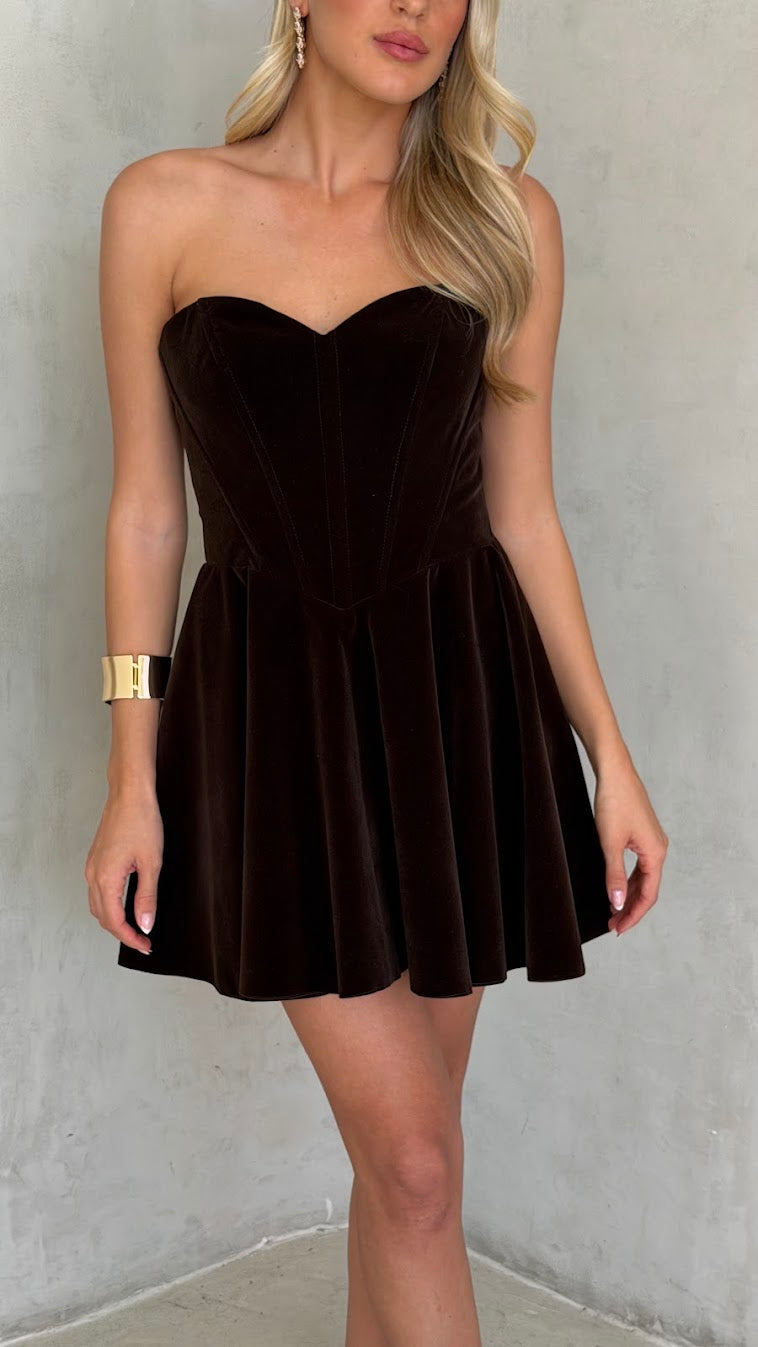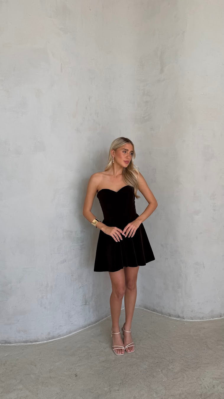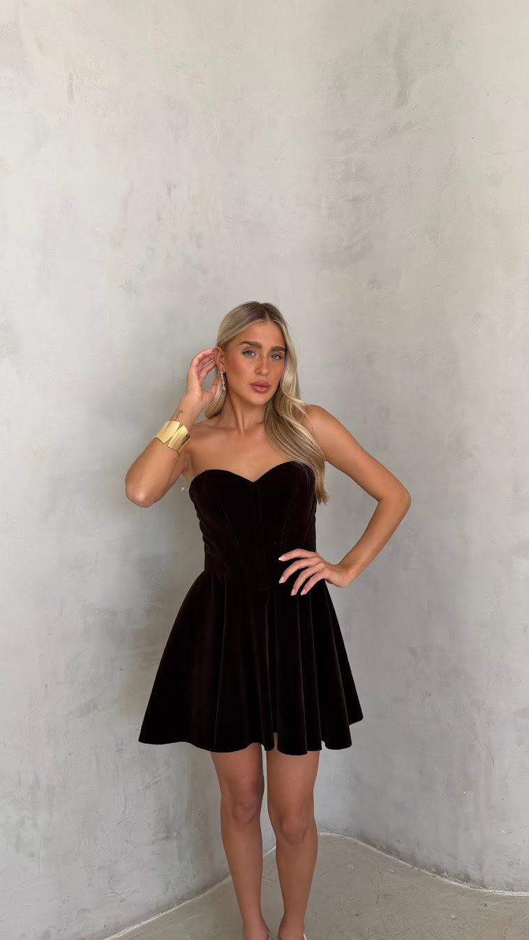 שמלת סטרפלס בעיצוב נקי ואלגנטי, עם גזרה מחמיאה המדגישה את קווי הגוף בצורה טבעית. השמלה עשויה בד רך ונשפך, בעל מגע נעים וגמישות קלה, היושב בצורה חלקה על הגוף ומאפשר נוחות לאורך כל הערב. החצאית באורך מיני עם נפילה רכה היוצרת תנועה עדינה ומראה נשי וקליל.