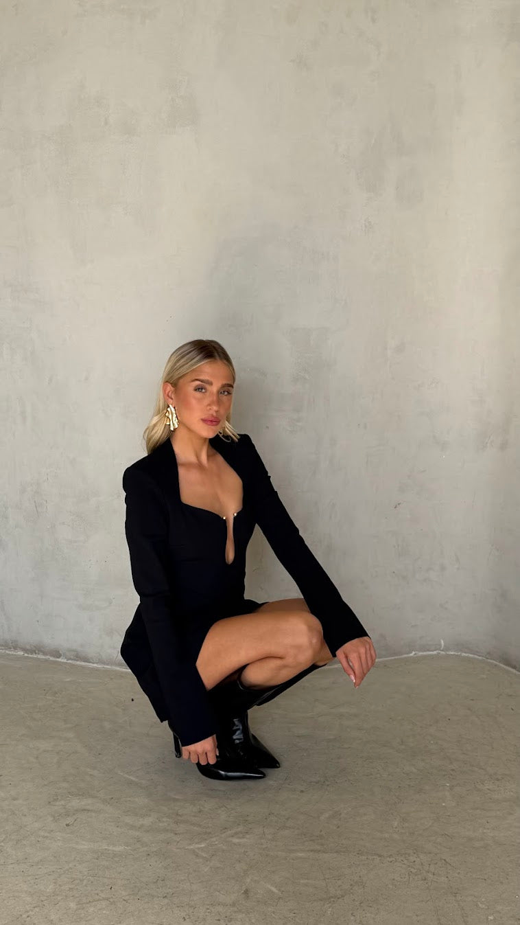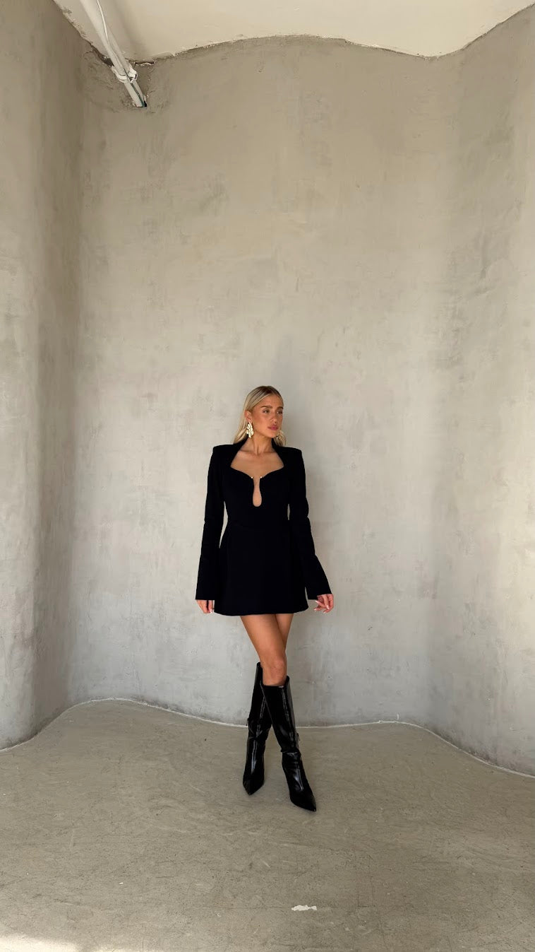 שמלת מיני שחורה בעיצוב מחויט, נשי ועוצמתי. השמלה מעוצבת עם שרוולים ארוכים בגזרה מדויקת וכתפיים מובנות היוצרות מראה אלגנטי ומודרני. בחלק הקדמי משולב מחשוף טיפה עמוק ומחמיא, המוסיף טאץ’ חושני מאוזן ומדגיש את אזור החזה בצורה אלגנטית.