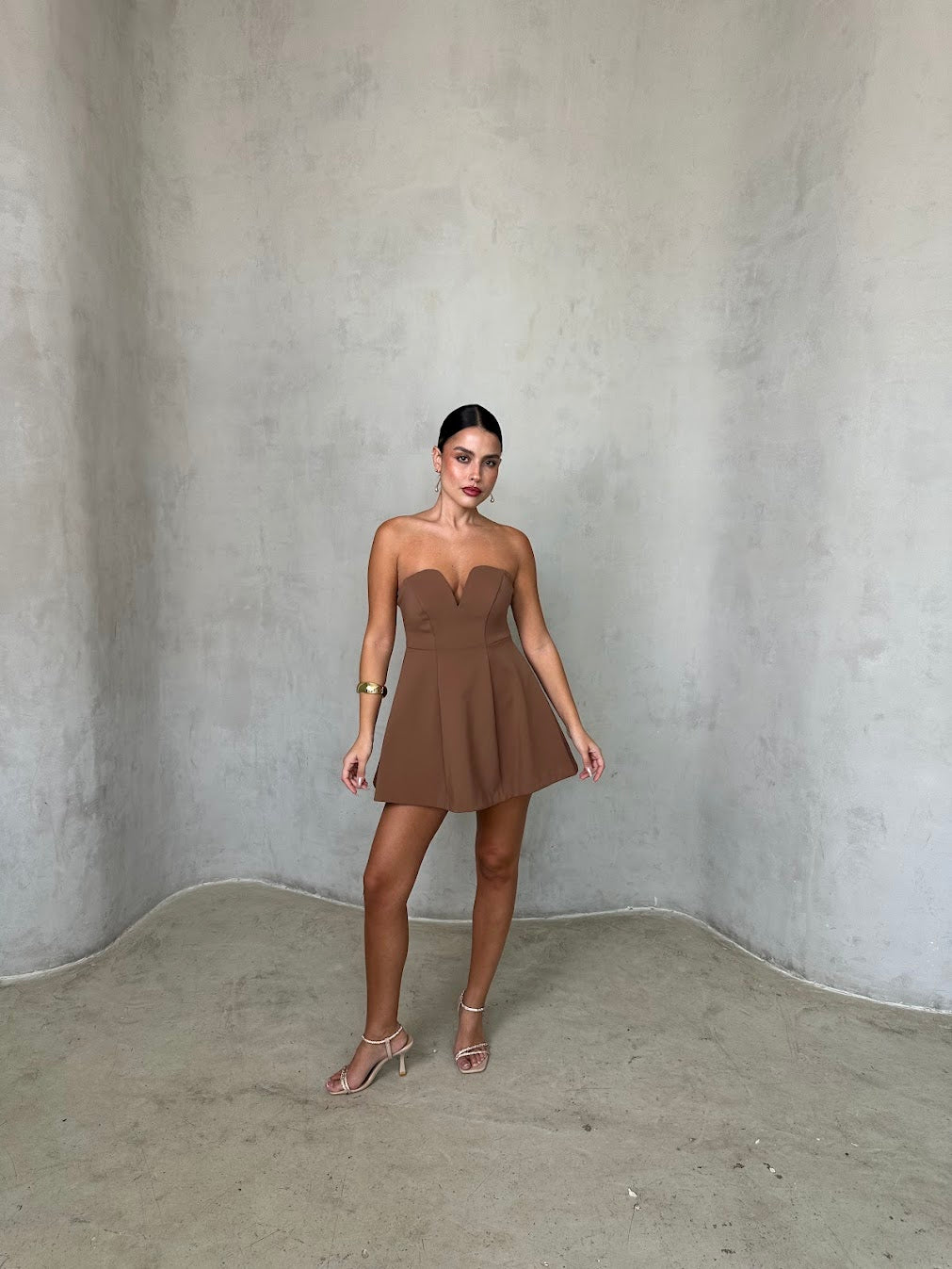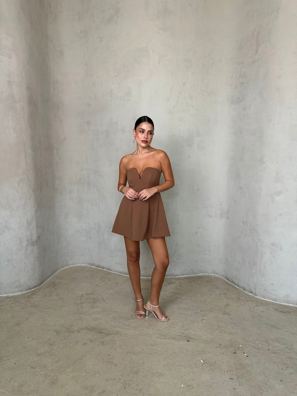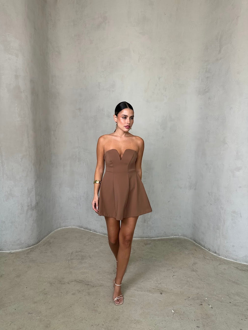 שמלת מיני סטרפלס עם מחשוף לב עדין וגזרה מחטבת בחלק העליון המתרחבת כלפי מטה. הבד בעל מראה חלק ואלגנטי, יוצר שילוב מושלם בין קלאסיות לשיק מודרני. מתאימה לאירוע ערב, דייט או בילוי אופנתי בעיר.