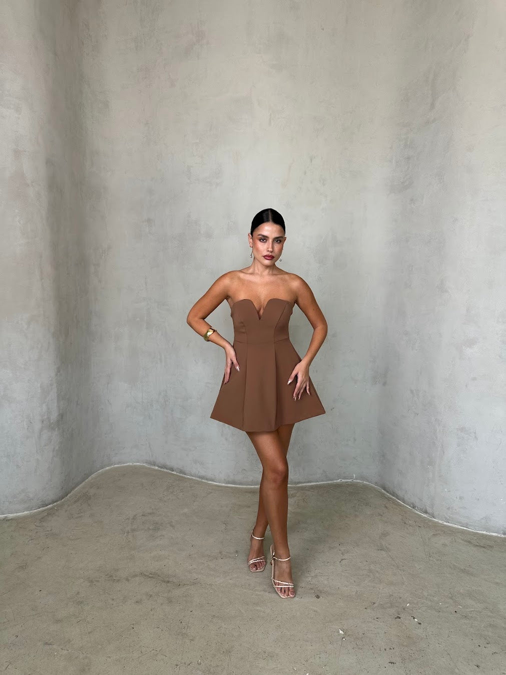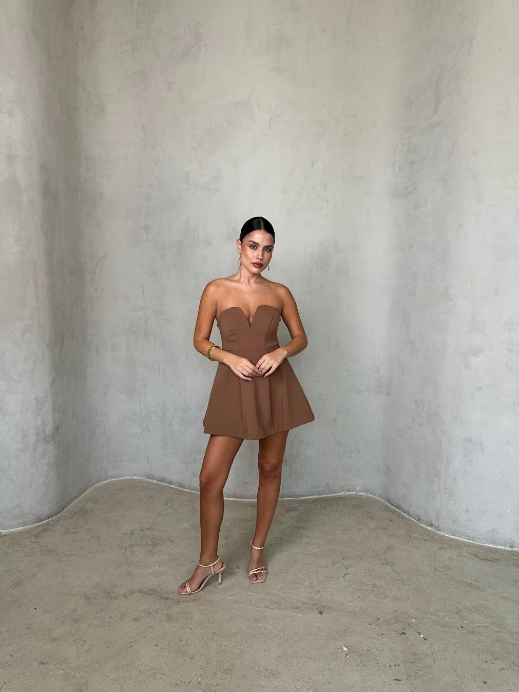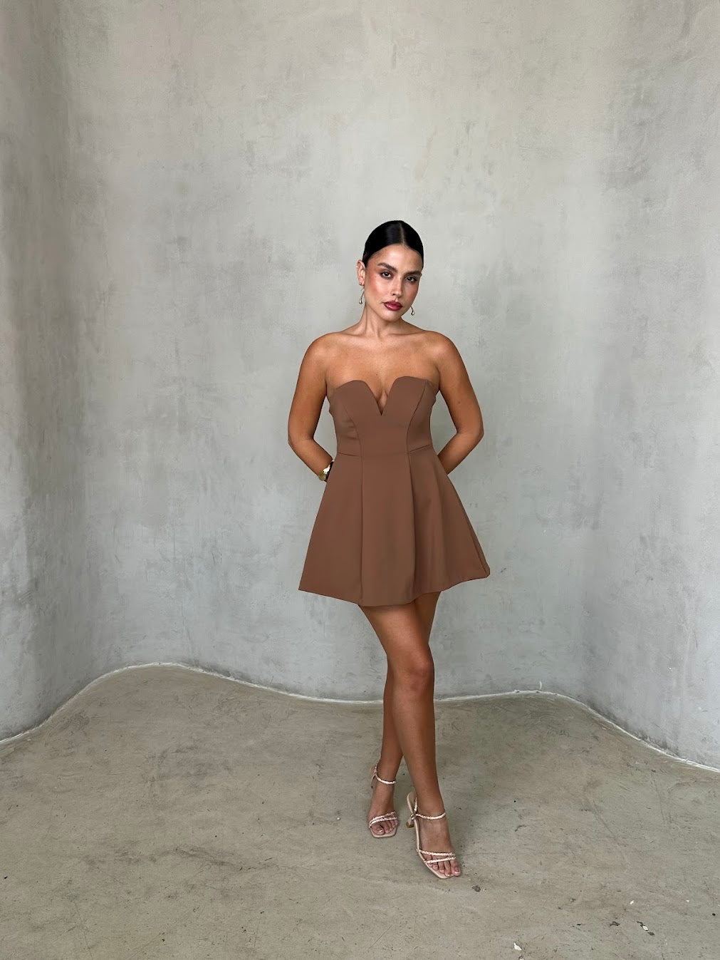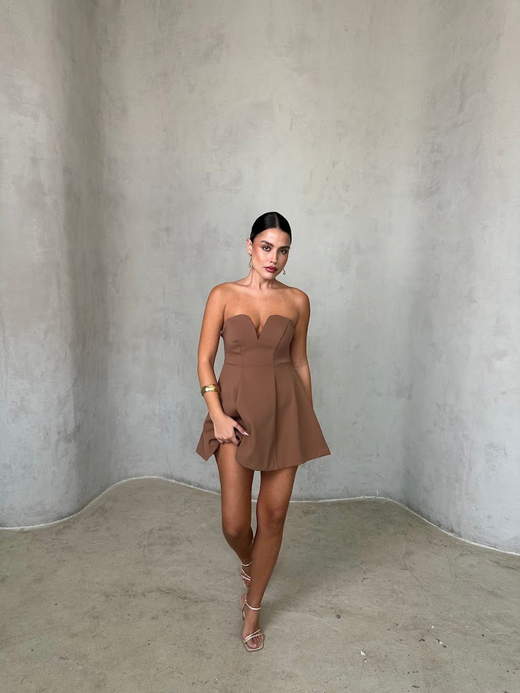 שמלת מיני סטרפלס עם מחשוף לב עדין וגזרה מחטבת בחלק העליון המתרחבת כלפי מטה. הבד בעל מראה חלק ואלגנטי, יוצר שילוב מושלם בין קלאסיות לשיק מודרני. מתאימה לאירוע ערב, דייט או בילוי אופנתי בעיר.