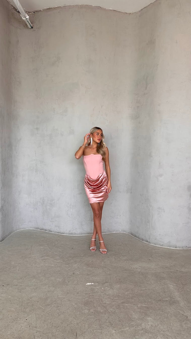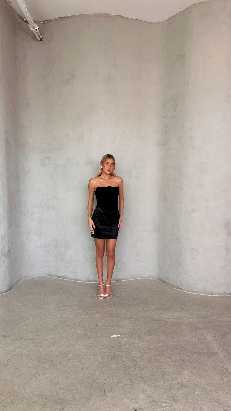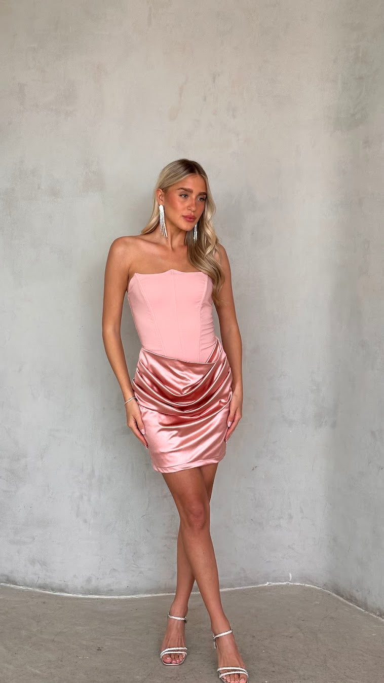 שמלה אלגנטית ומחמיאה בעיצוב נשי מדויק. חלק עליון בגזרת סטרפלס עם מבנה מחוך המדגיש את קו המותן ומעניק תמיכה וחיטוב. החלק התחתון עשוי בד סאטן מבריק עם קפלים רכים היוצרים מראה יוקרתי וזורם