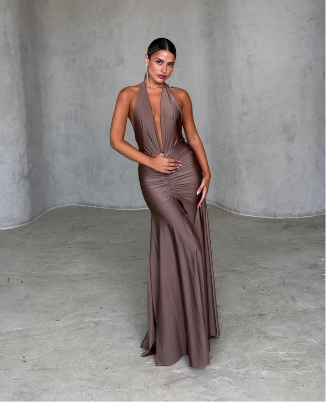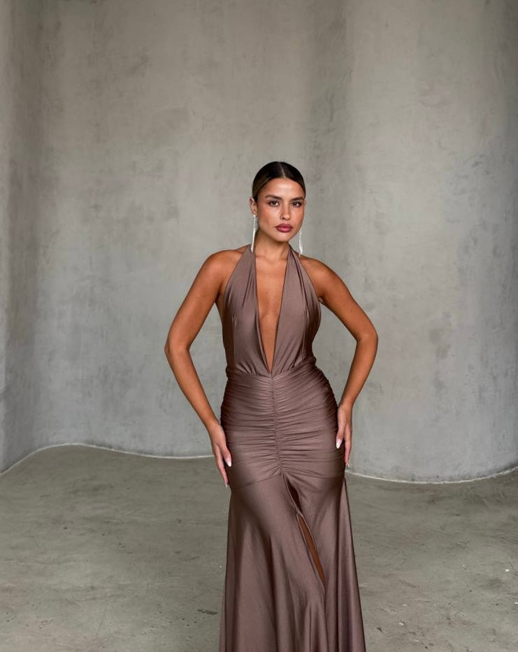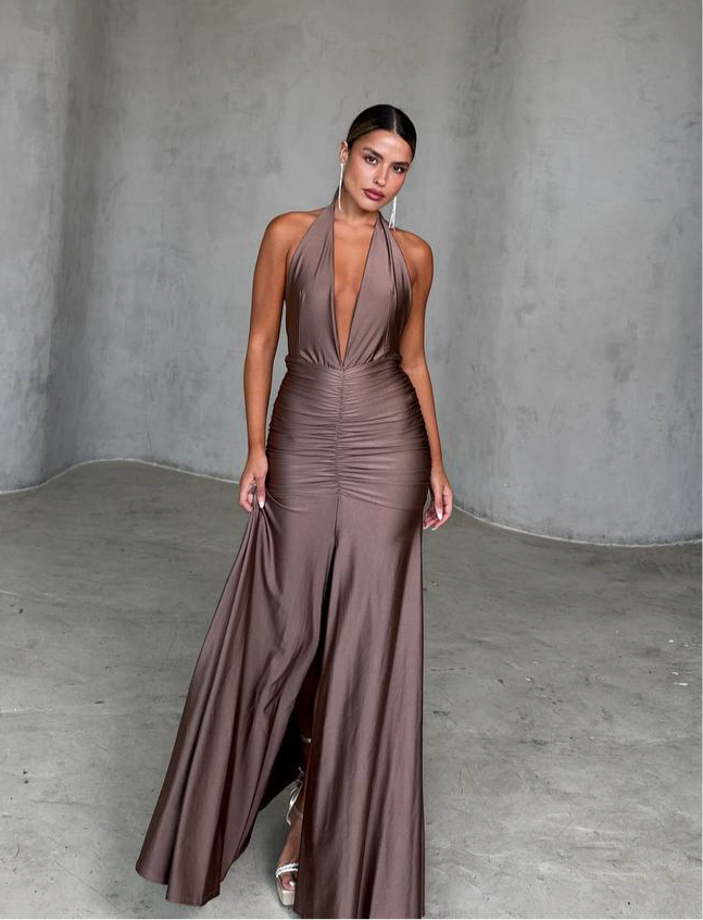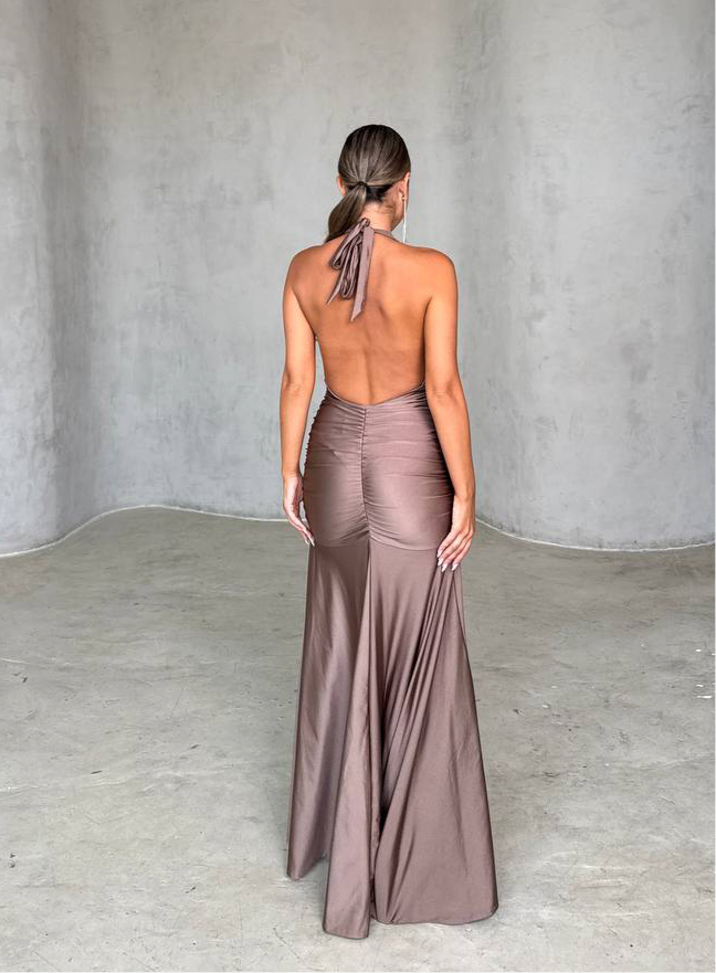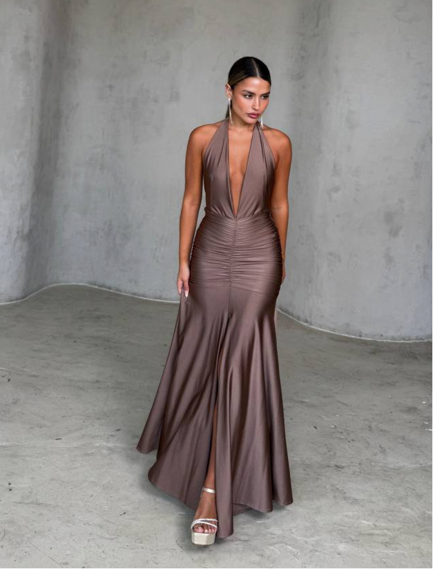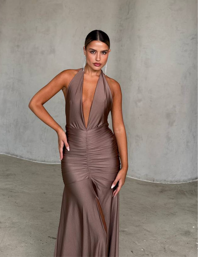 שמלה קאן - שמלה מבד לייקרה מחטב ונמתח בגזרת קולר ומחשוף בגב , ושילוב כיווצים.