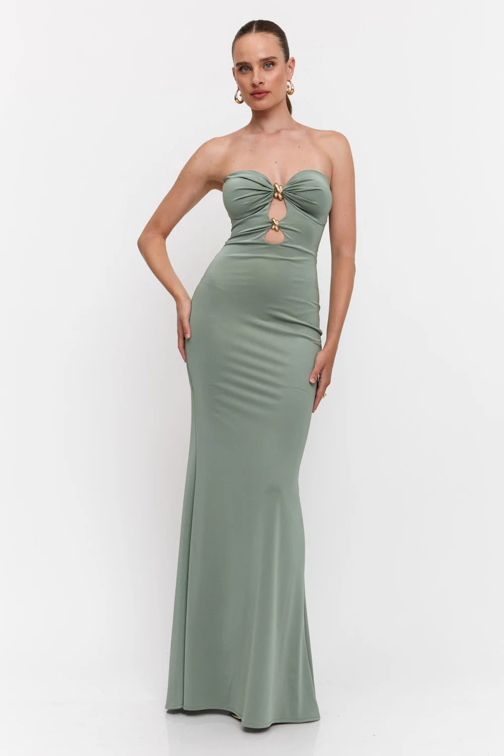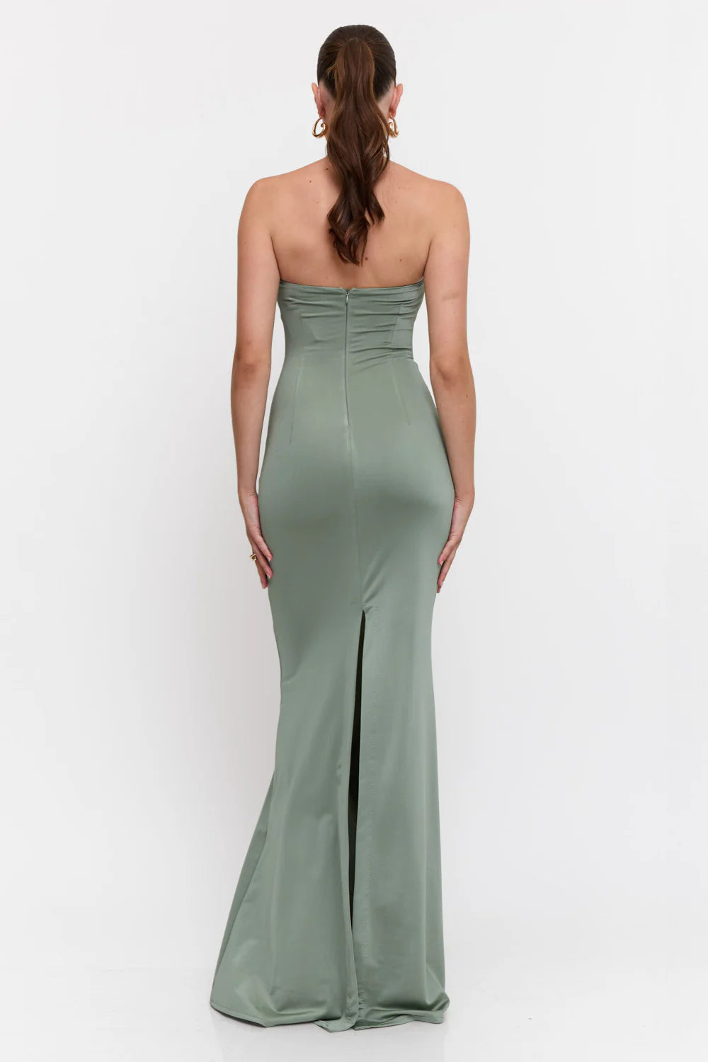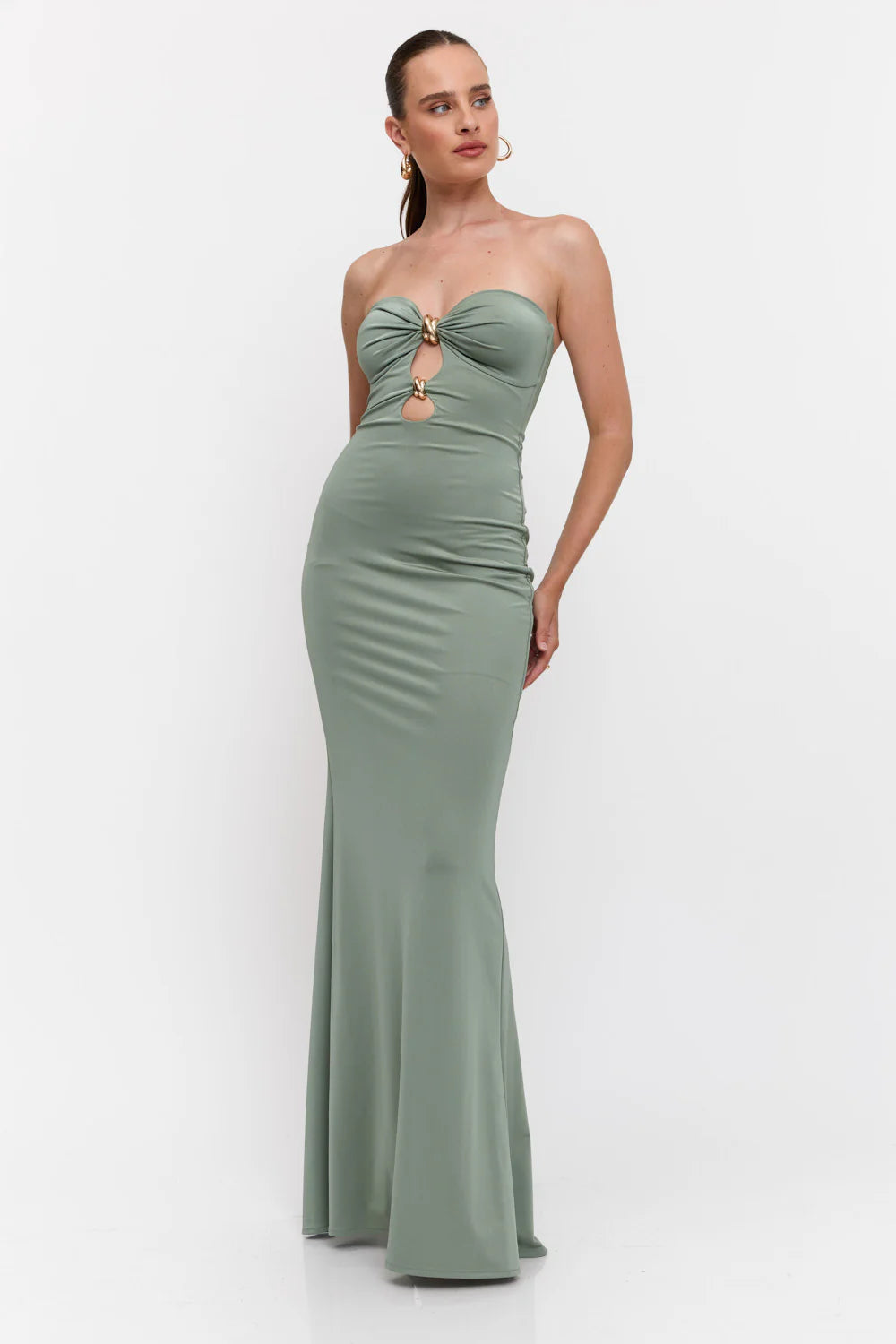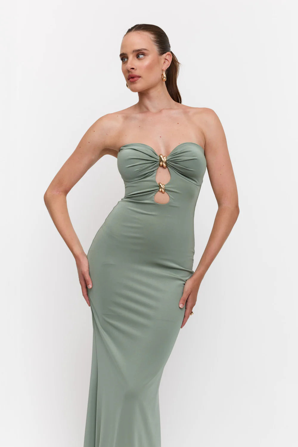 שמלה מקסי סטרפלס בעיטור של אלמנט זהב כפול מקדימה עם שסע מאחורה מבד מחטב ואיכותי