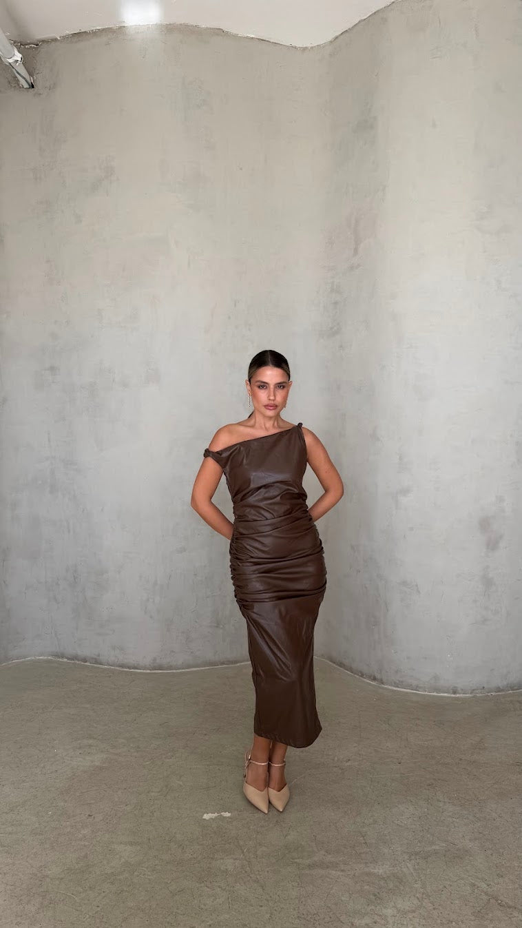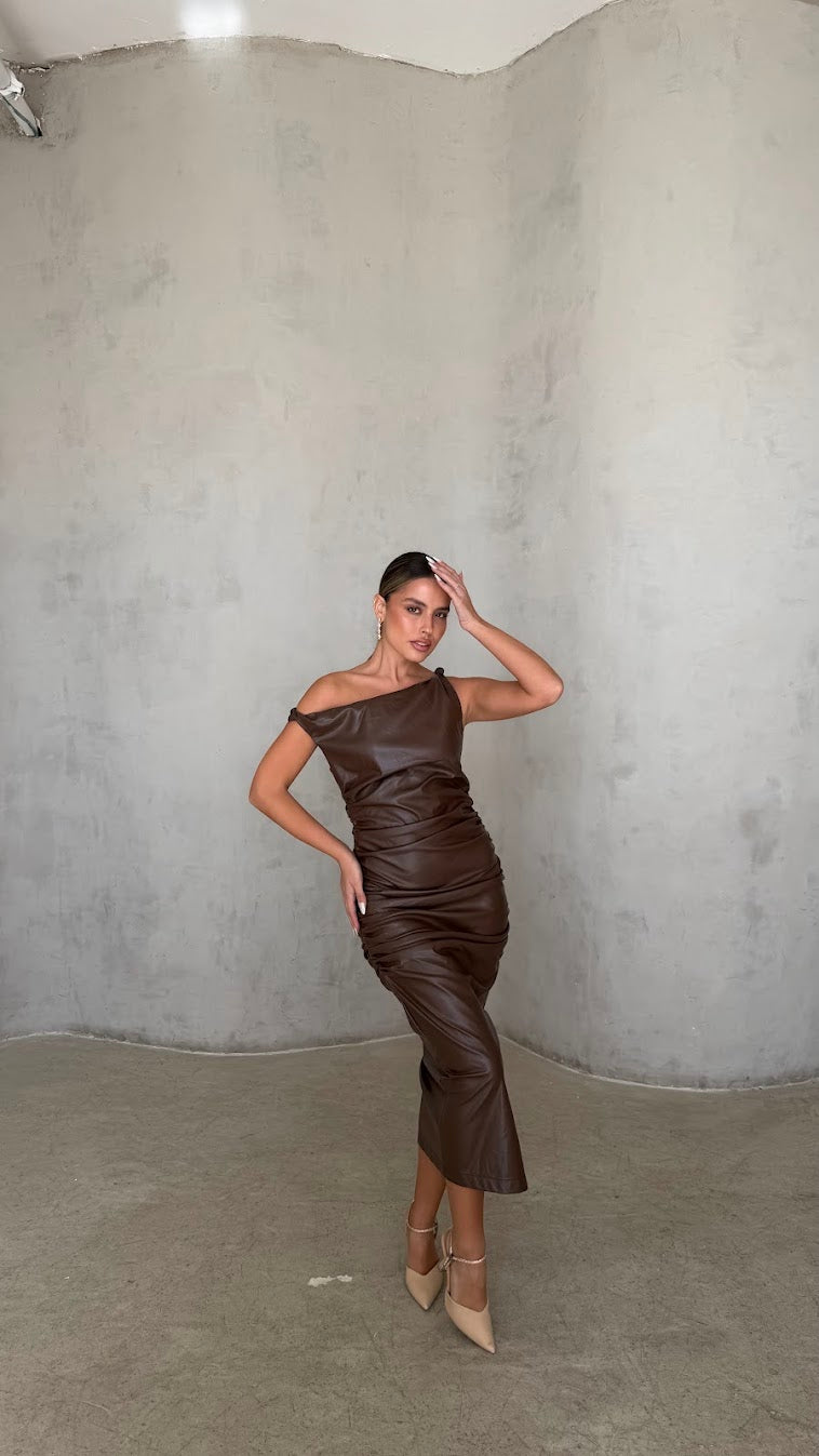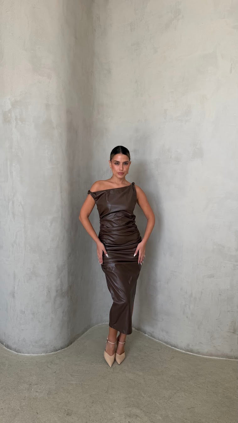שמלת מידי דמוי עור בגזרה מחטבת עם מחשוף א-סימטרי ייחודי שמדגיש את קו הכתפיים והצוואר.