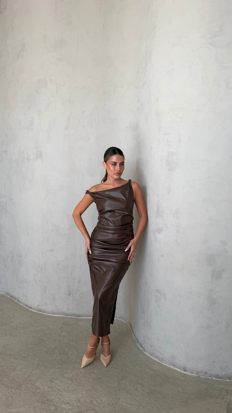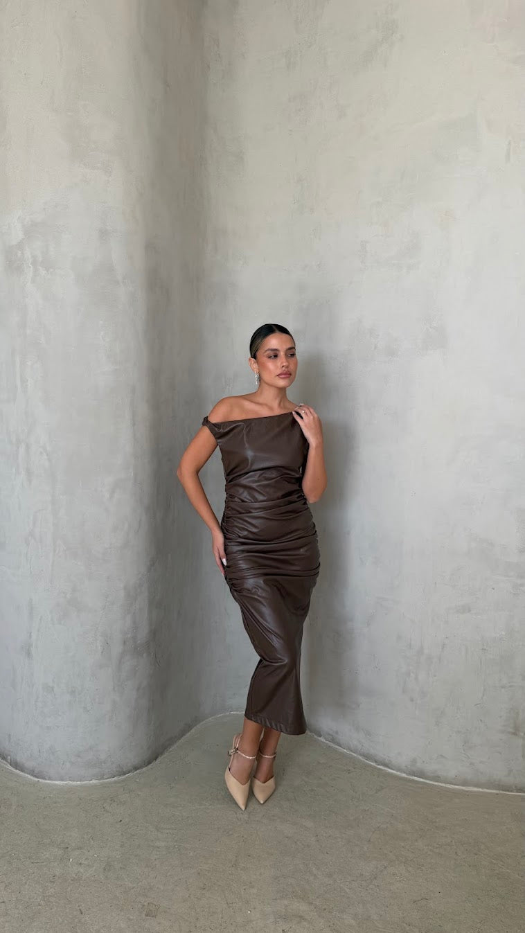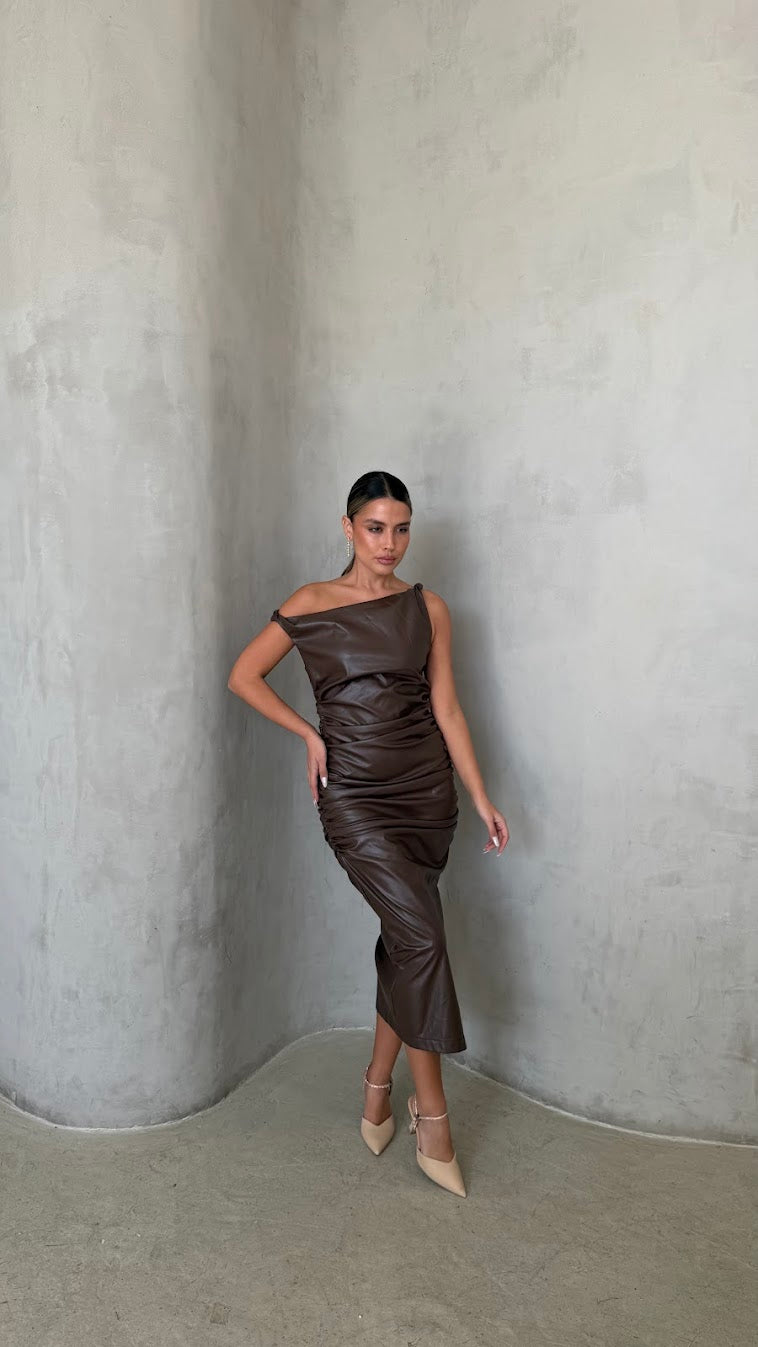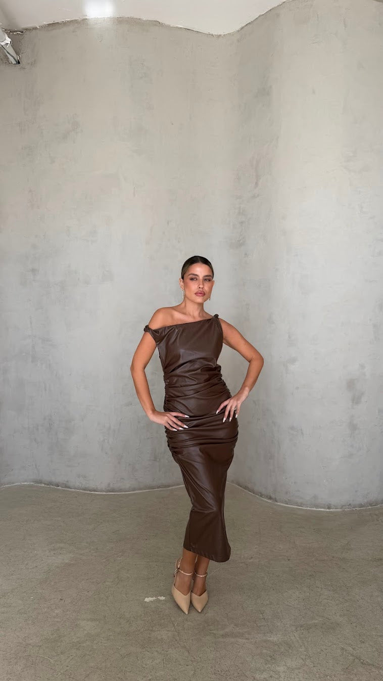שמלת מידי דמוי עור בגזרה מחטבת עם מחשוף א-סימטרי ייחודי שמדגיש את קו הכתפיים והצוואר.