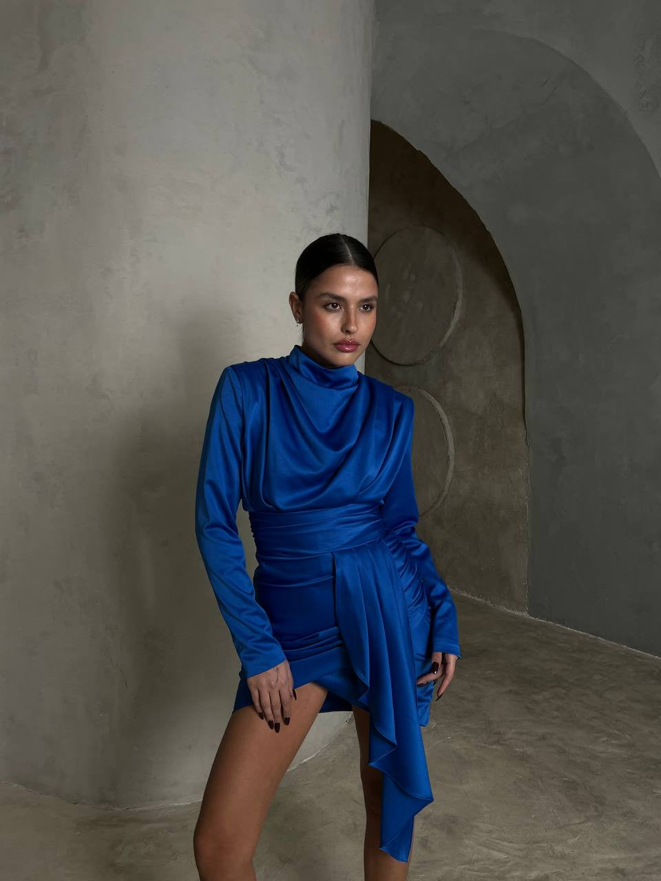 שמלת סאטן עם רבידה מלפנים ושרוולים ארוכים שסע קדמי קטן ושובל בד לצידו .