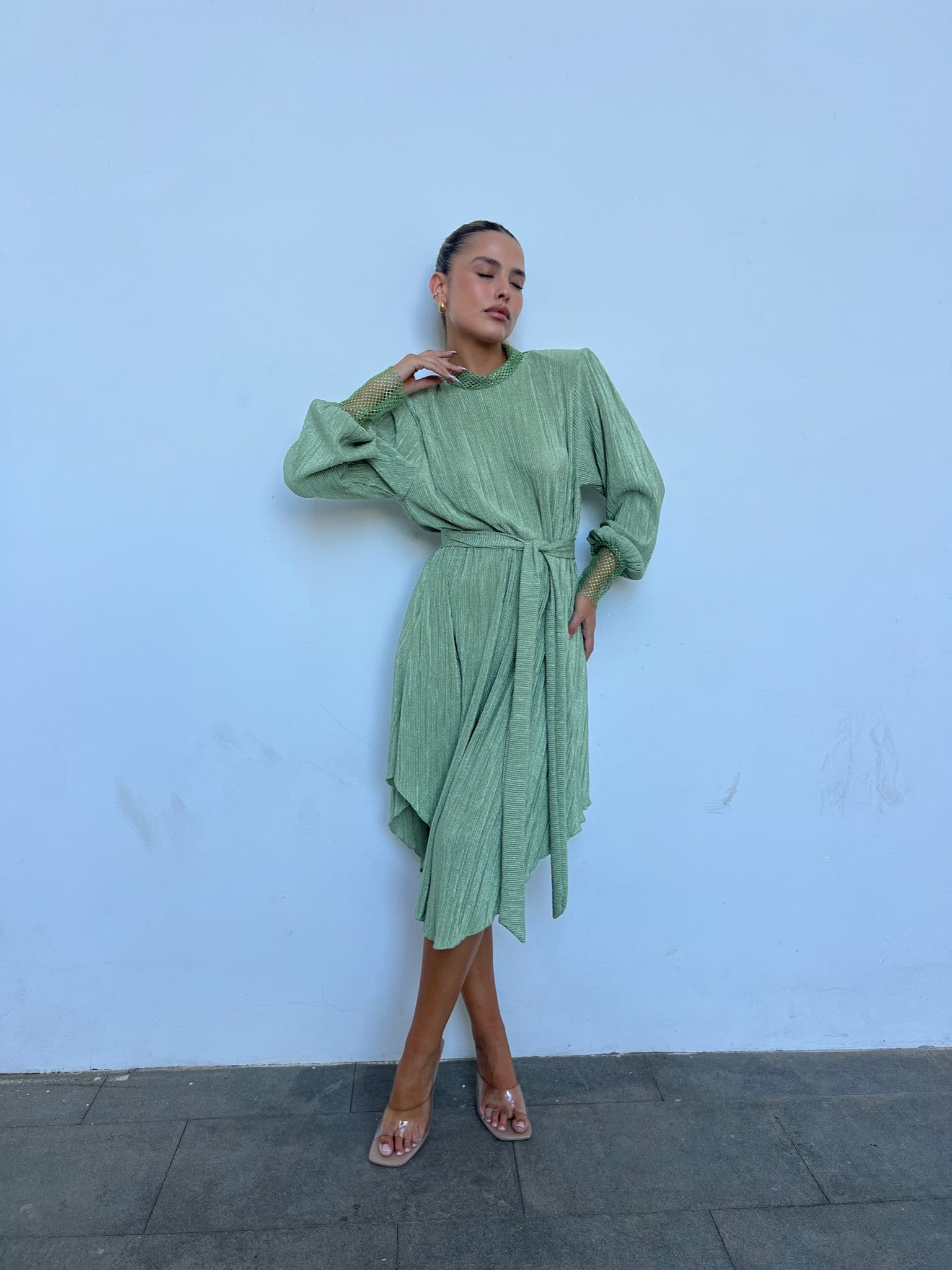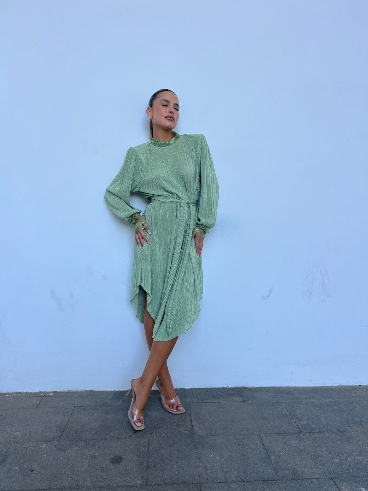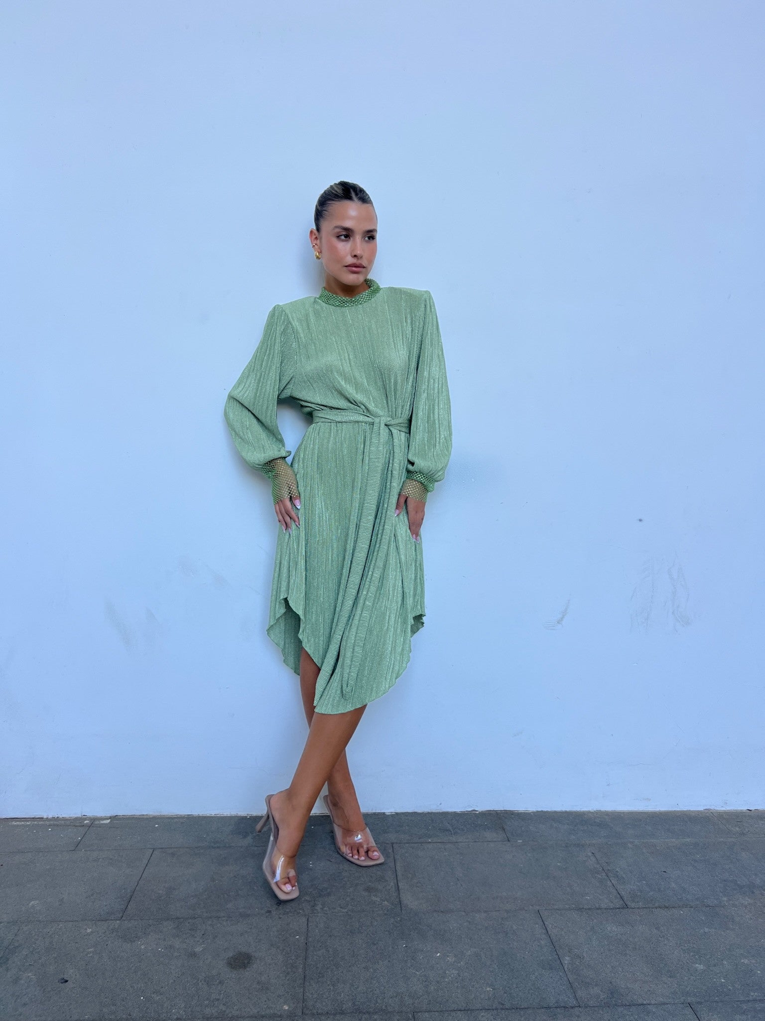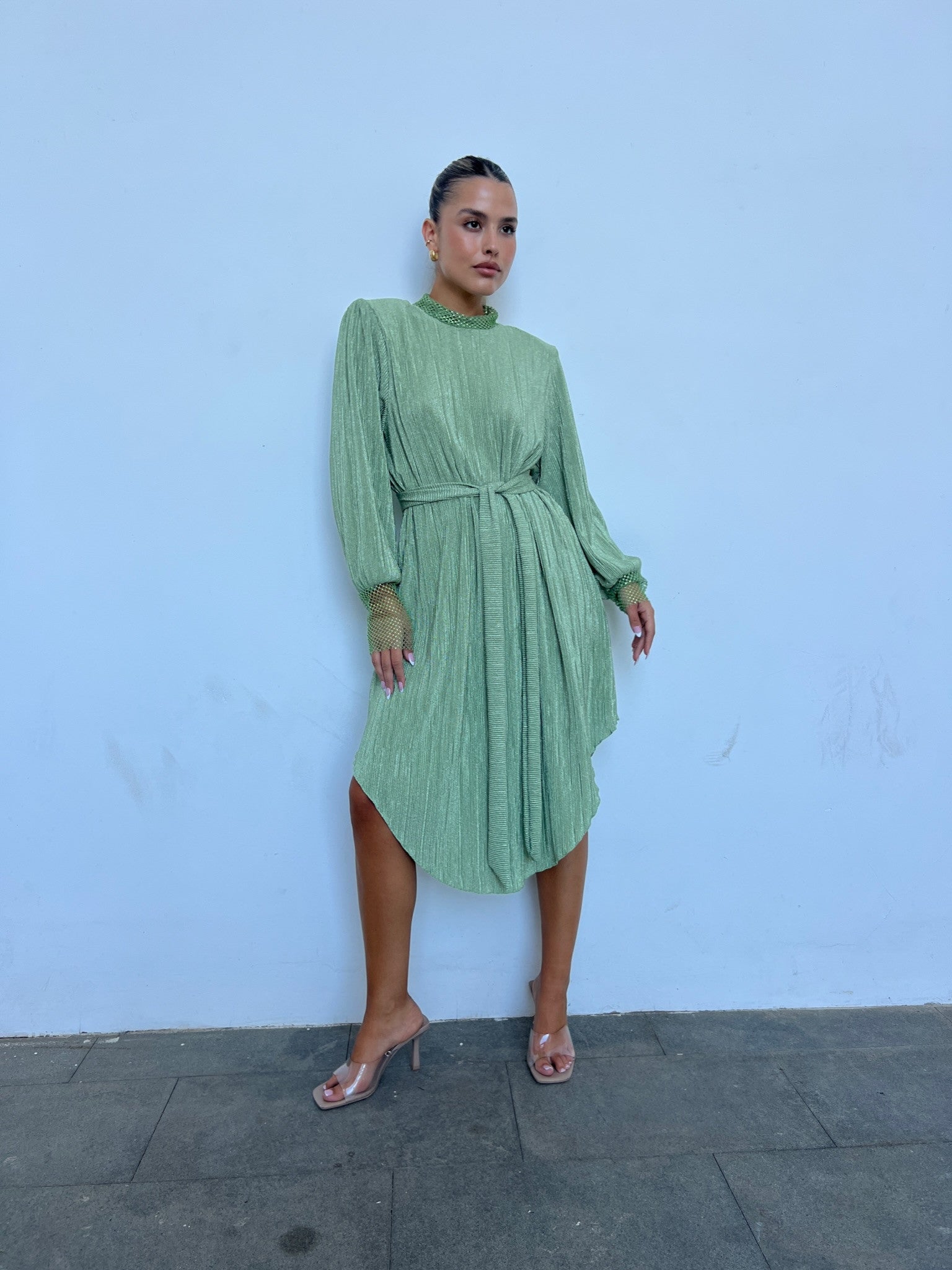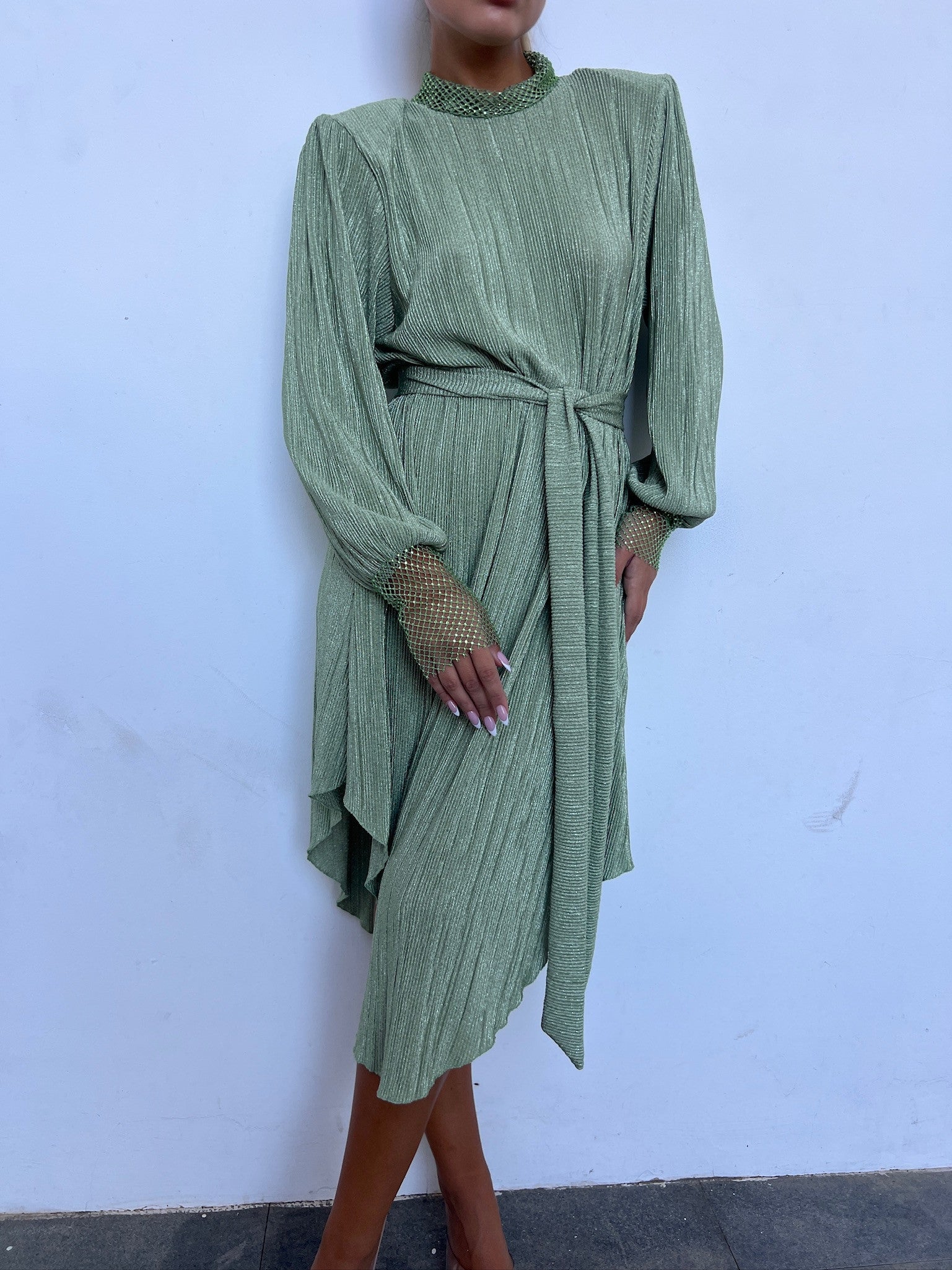 שמלה מבד פליסה קליל ונשפך כריות בכתפיים מנגט רשת אבנים וגם בצווארון.
