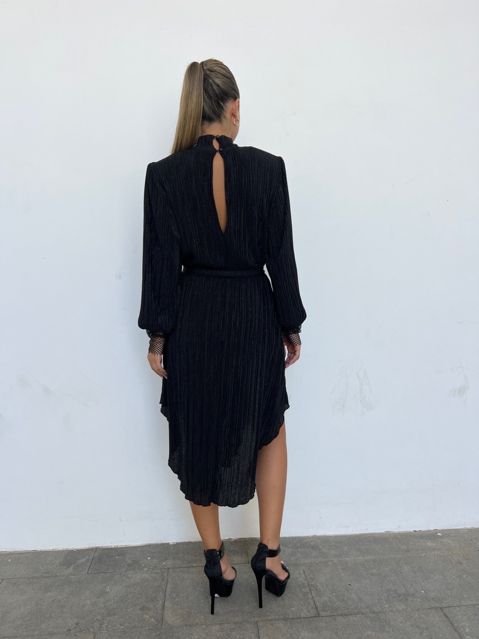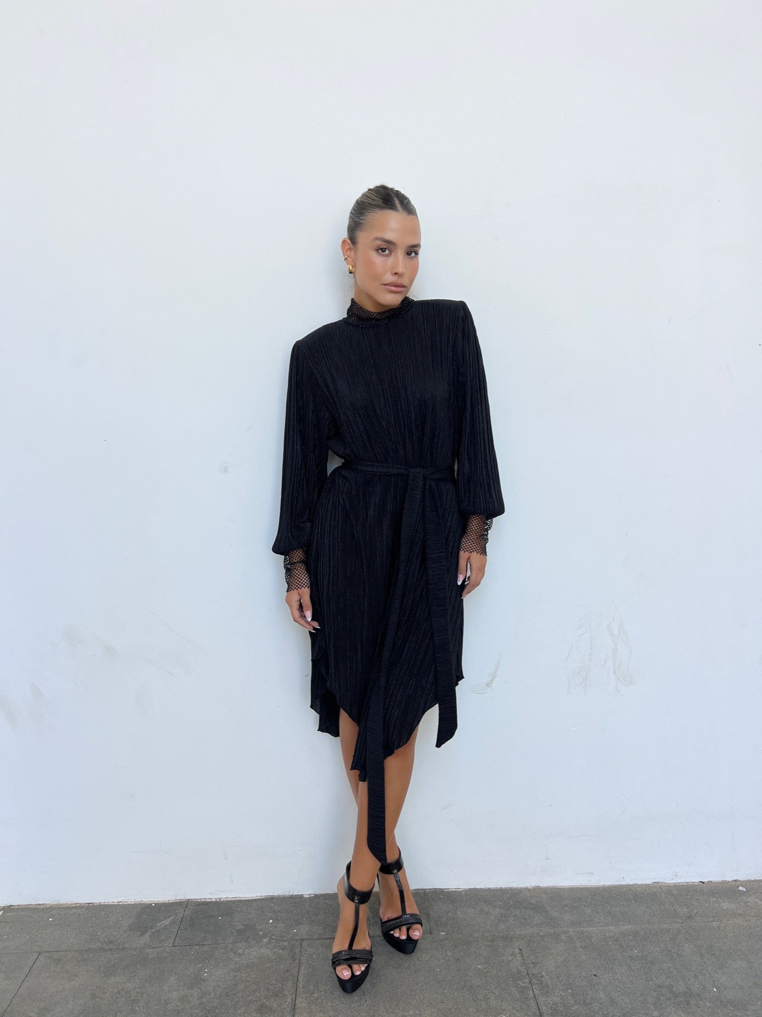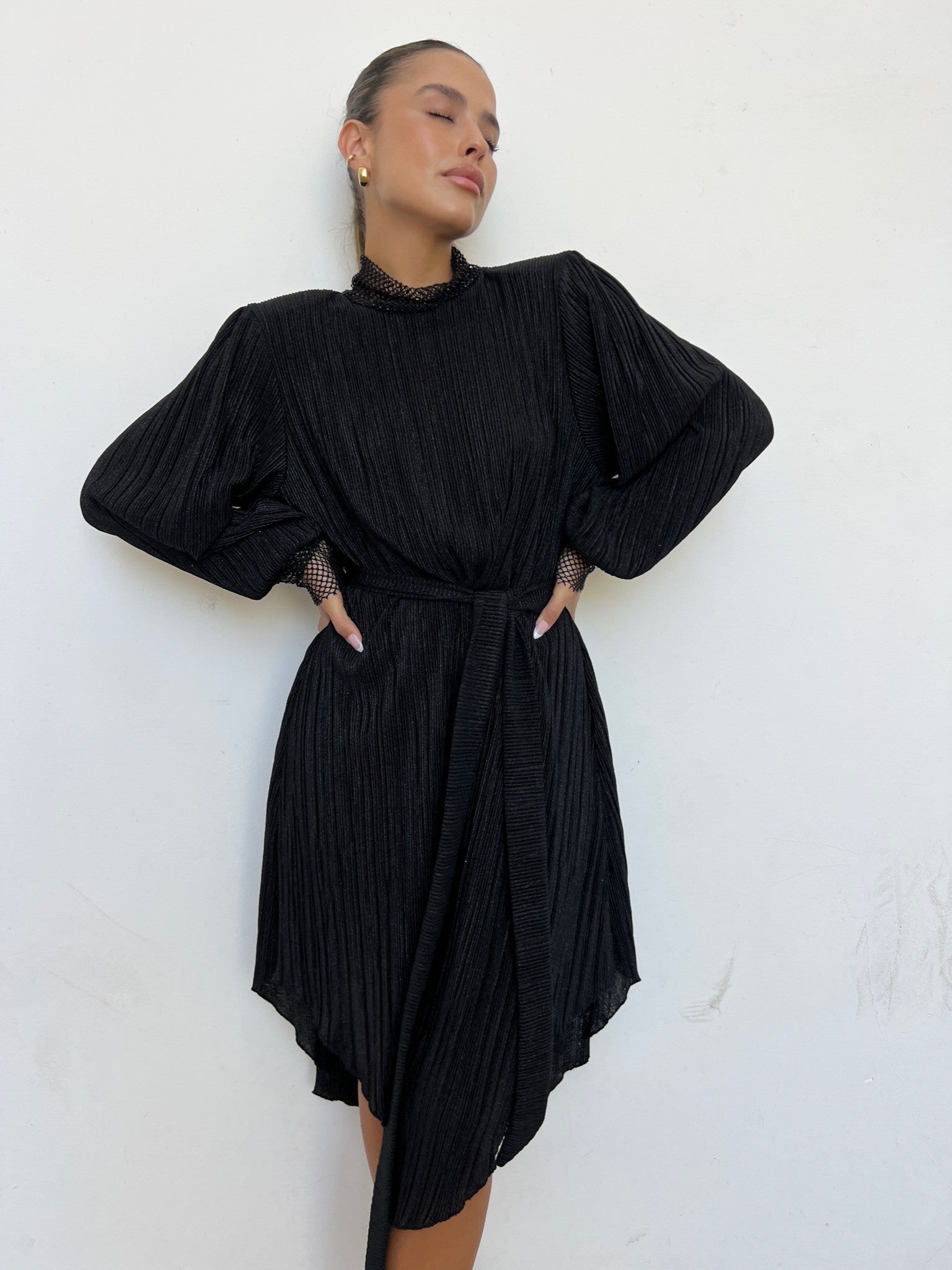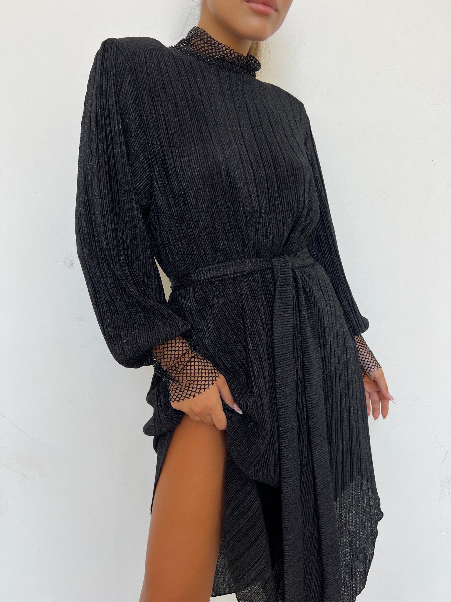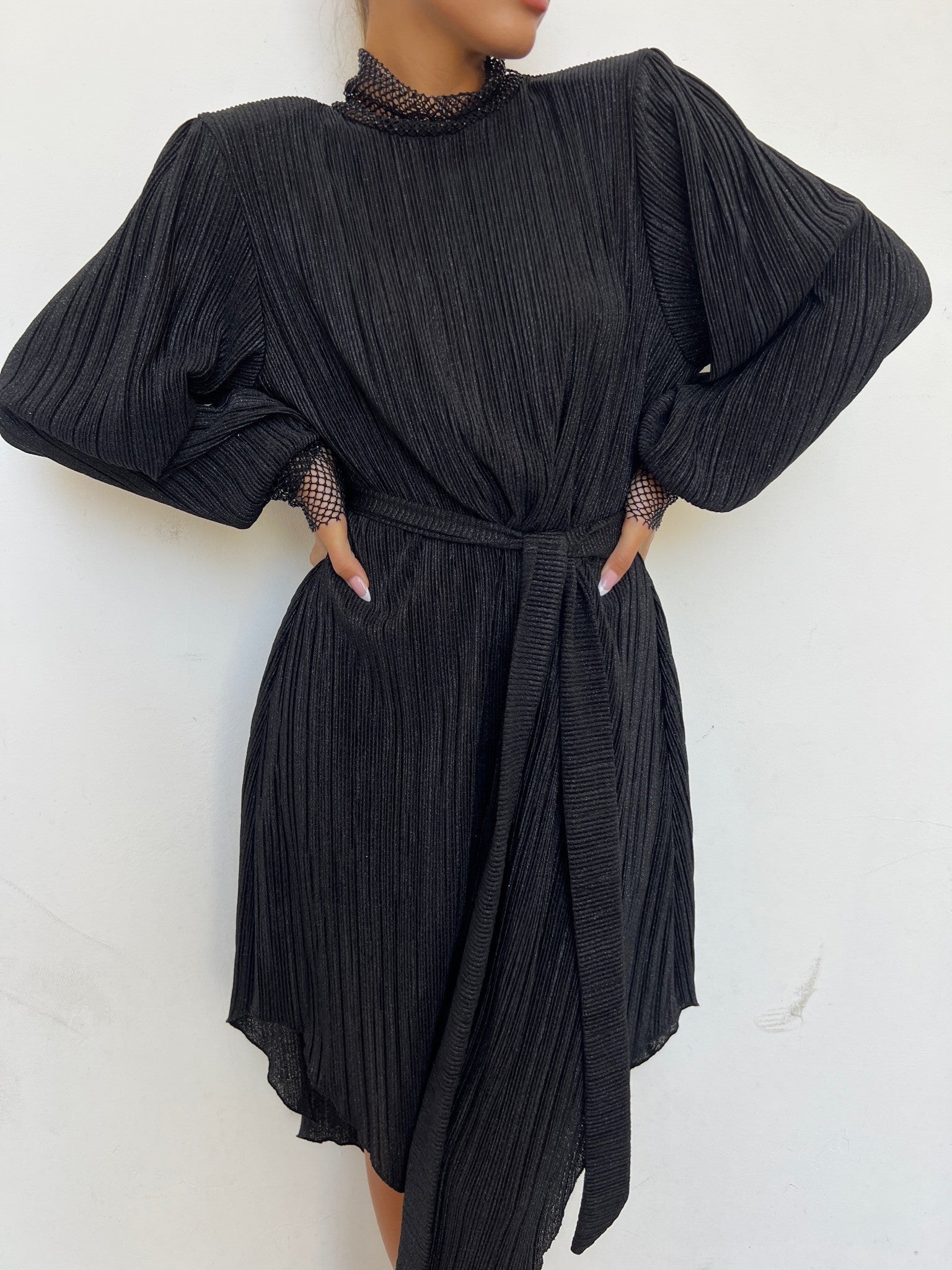 שמלה מבד פליסה קליל ונשפך כריות בכתפיים מנגט רשת אבנים וגם בצווארון.