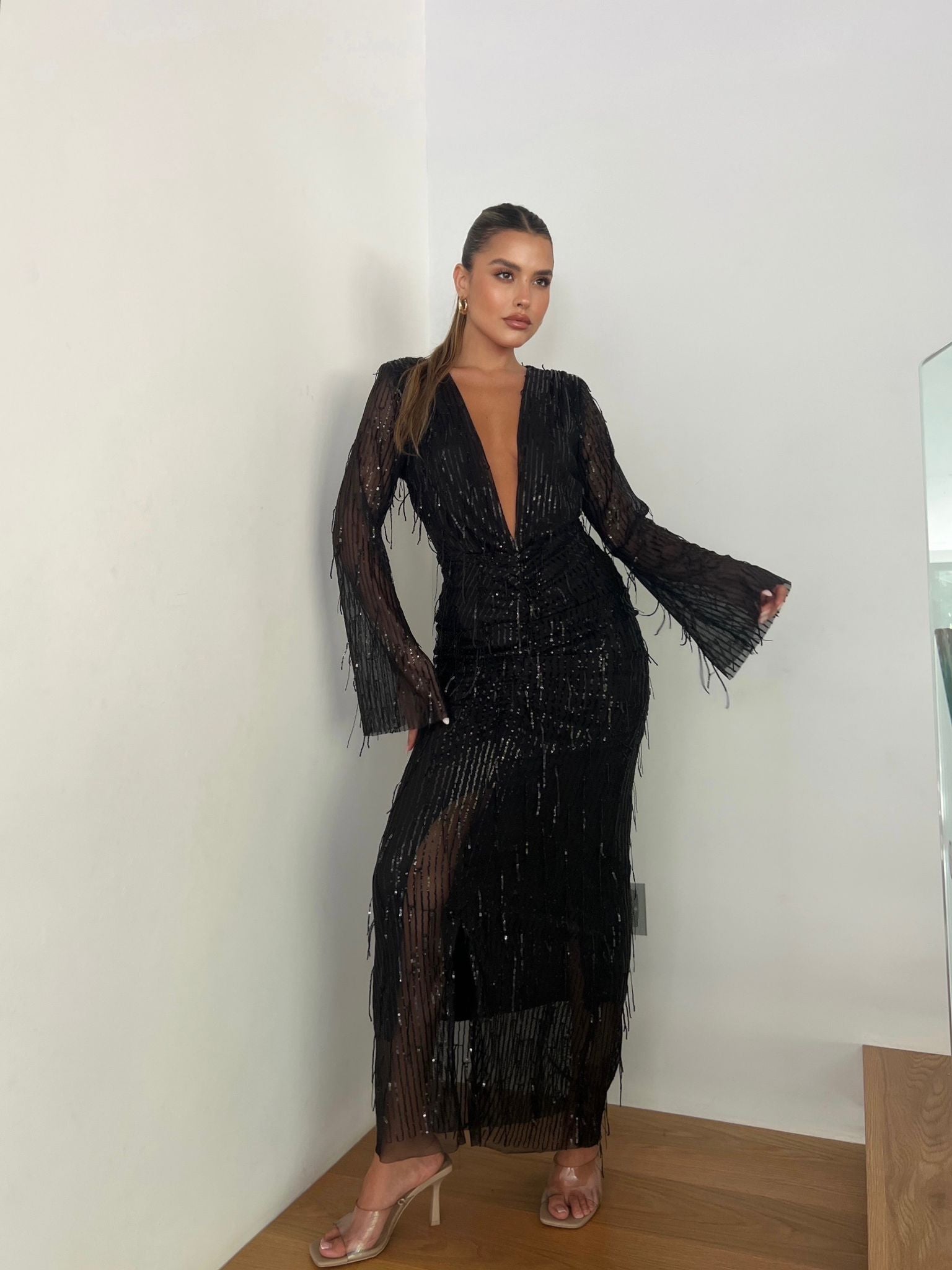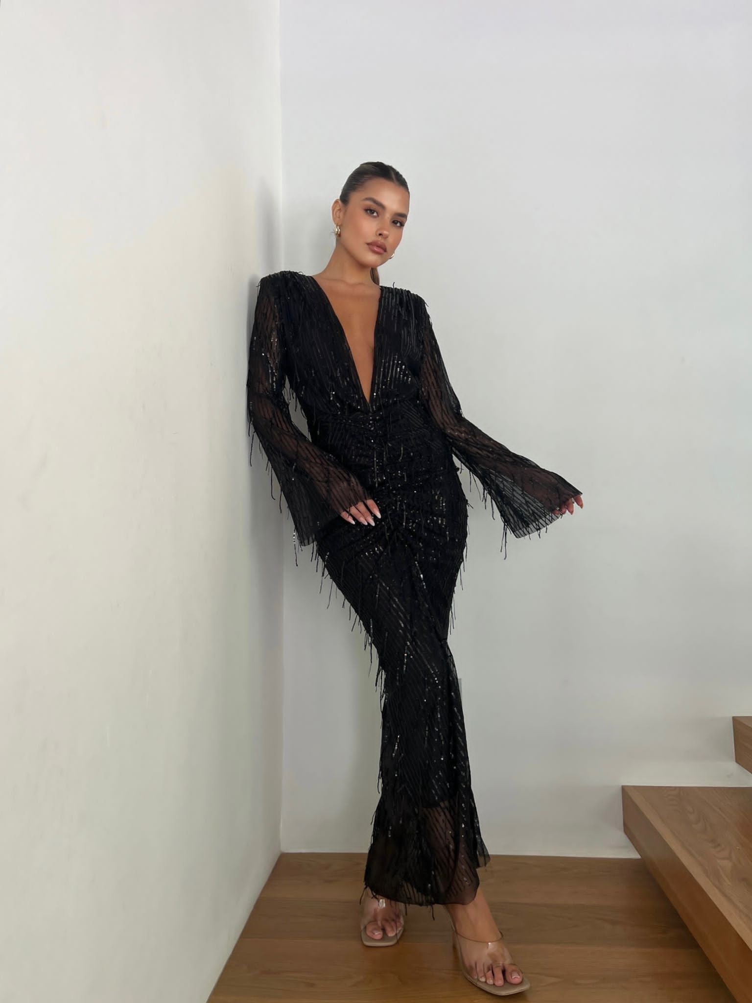 שמלת מקסי עם שרוולים ארוכים ,מפתח וי בחזה (ניתן לסגירה) וכיווצים באזור הבטן גזרה מאוד מחמיאה, מבד פייט פרנזים מיוחדים .