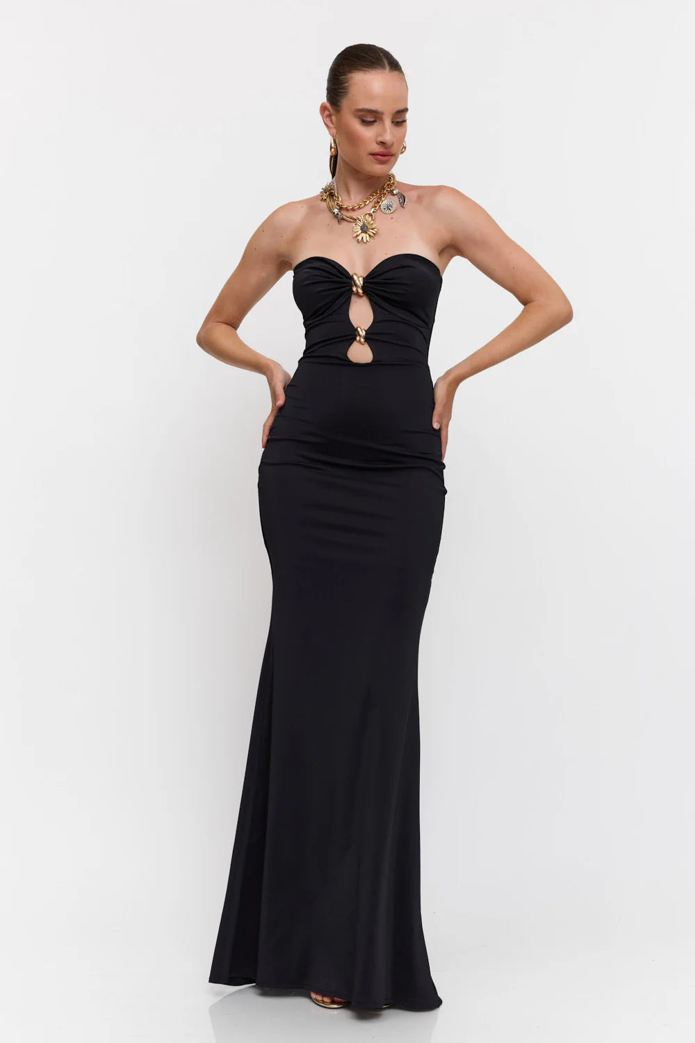 שמלה מקסי סטרפלס בעיטור של אלמנט זהב כפול מקדימה עם שסע מאחורה מבד מחטב ואיכותי