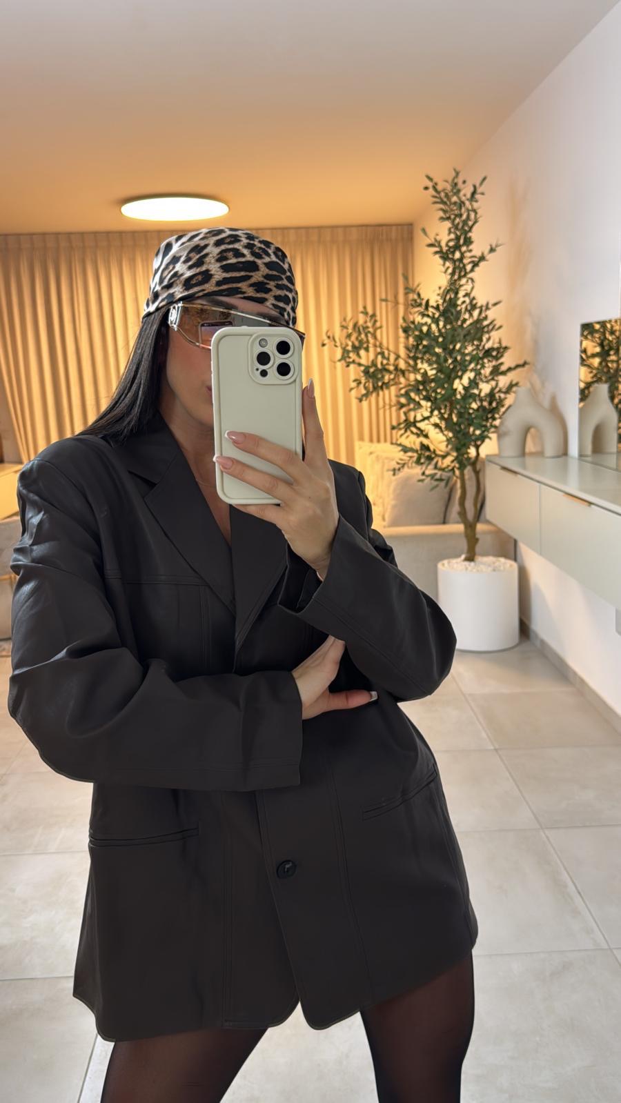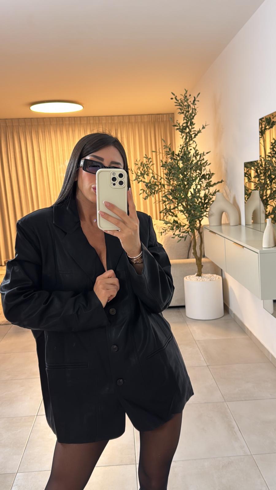 בלייזר בגזרה רחבה ומחמיאה, עם קו מחויט שמשלב בין מראה קלאסי לסטייל יומיומי עדכני. עשוי בד דמוי עור חלק ונעים למגע, עם נפילה רכה שנותנת לוק אלגנטי ולא מתאמץ. כולל צווארון מחויט, סגירת כפתורים קדמית וכיסים קדמיים פונקציונליים.